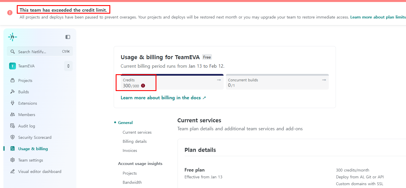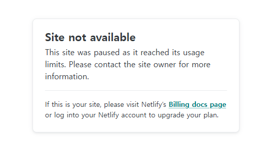 Billing docs page 링크를 보니까 이건 내 코드가 멈춘 게 아니라 Netlify 쪽에서 사이트를 강제로 내려버린 상황이라는 짐작이 갔다.