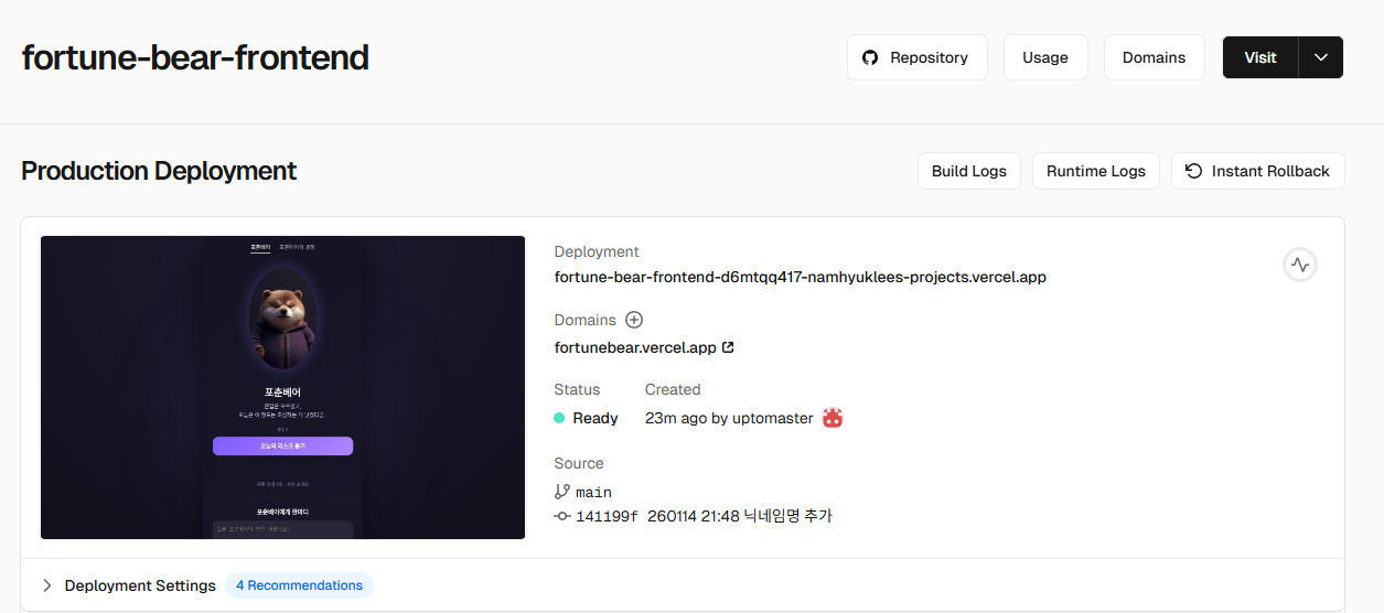 Netlify는 일단 현재는 정리하고 FortuneBear 프론트는 Vercel로 이전하게 되었고