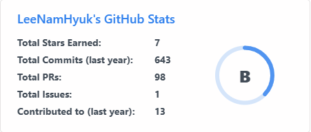 그리고 깃허브 페이지를 만들면서 stat 카드를 처음 사용해보게 되었는데 커밋 기록이 643회, PR 98회 등 작년에 꽤 열심히 깃허브 활동을 했다고 생각했는데 랭크가 B가 나왔길래 살짝 서운하긴했다. 그래도 상위 퍼센트로 확인해보면 상위 30%에 해당하기도 하고, 깃허브를 시작한지 1년만에 이 정도로 열심히했다면 그걸로도 만족스러운 결과고 앞으로 더 열심히 해야겠다는 목표도 다시 한번 생긴 것 같다.