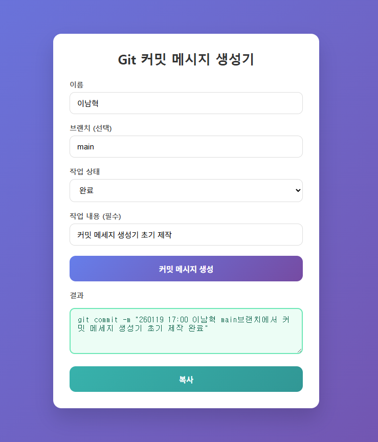 기능은 이름, 브랜치, 작업 상태, 작업 내용만 입력하면 바로 git commit -m 형태의 명령어가 만들어지도록 했다. 브랜치는 항상 쓰는 건 아니라서 비어 있으면 메시지에서 자동으로 빠지게 처리했고, 작업 상태는 작업중이랑 완료 두 가지로만 나눴다.