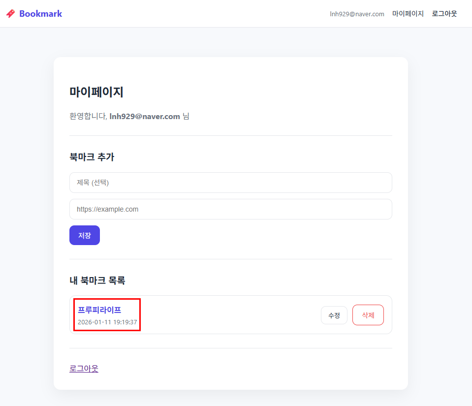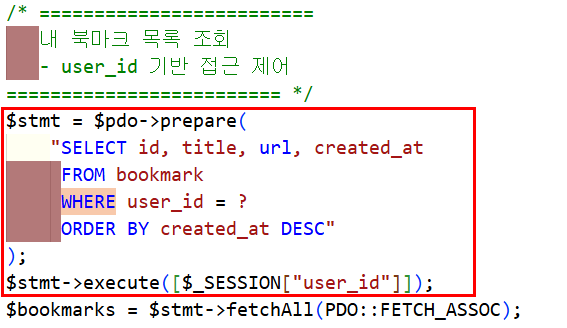 북마크 조회 시 URL 파라미터가 아니라 세션의 user_id를 기준으로 데이터를 가져온다.
